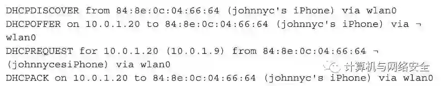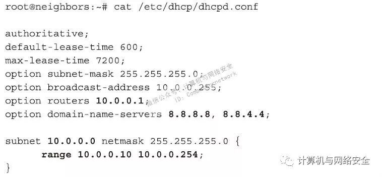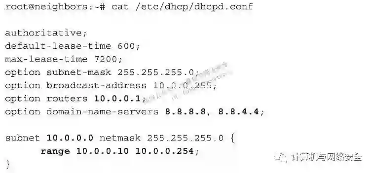 当有一个客户端和我们的AP接入点建立关联以后,该客户端要做得第一件事是试图申请一个符合该网络规则的IP地址。在大多数的无线网络中,IP地址的发放使用“动态主机配置协议”(Dynamic Host Configuration Protocol,DHCP)。具有这样功能的程序很多,比如isc-dhcp-server就是一款,“I-love-my-neighbors”虚拟机也包含了一个该软件的模板配置文件(template configuration file),其文件名为dhcpd.conf。具体描述如下。