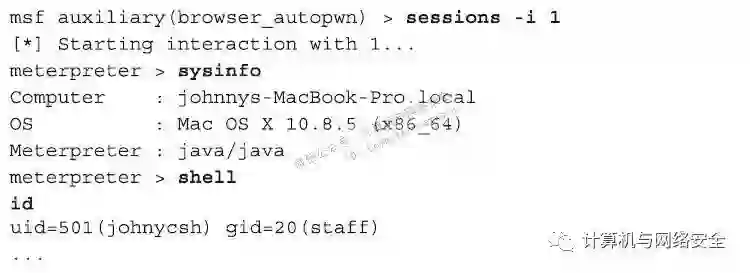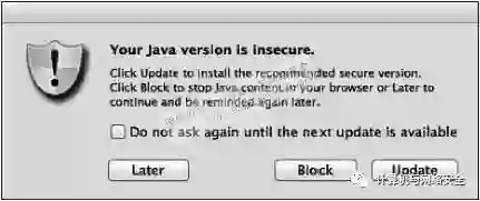 在下面的例子中,在OS X操作系统上使用Firefox浏览器,在浏览browser_autopwn以前的URL的时候,存在一个Java的“运行时”(runtime)漏洞。假设有一个用户在看到所有关于运行时Jave“超时”(out-of-date)的警告,在发生这种问题的时候,通常会有很多提示信息,图2只是显示了其中一个。如果该用户仍然单击通过的时候,就会在您的msfconsole窗口上,看到如下的信息提示输出出来。