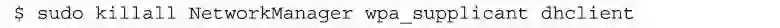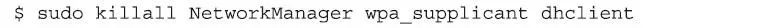 首先,我们要将我们的无线网卡连接到目标网络上。完成这样的操作,我们可以使用图形化的“网络管理”(NetworkManager)工具进行连接,也可以从命令行配置网络接口。我们可以把所有可能会干扰我们连接网络过程的程序都停掉,这包括“网络管理”程序本身、dhclient程序和wpa_supplicant程序: