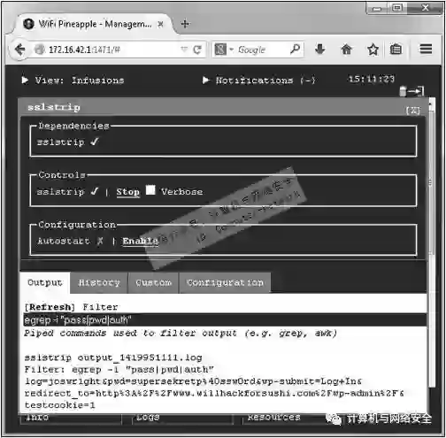 要使用“SSLStrip注入攻击”,只须打开程序的“tile条”接口,单击Install链接。然后单击Start链接以便启动SSLStrip攻击。每当有客户端设备连接到“Wi-Fi小菠萝”(这个时候,它的角色是AP接入点),并且通过它,采用HTTP的方式访问一个兼容支持“安全套接层”站点时,“Wi-Fi小菠萝”(这个时候,它的角色就变成了攻击者)就会像上述所说的那样进行内容的“交换”,这里的“交换”除了协议格式的变换,当然中间也包括了证书的认证,以及数据内容的检索。其显示效果如图6所示。