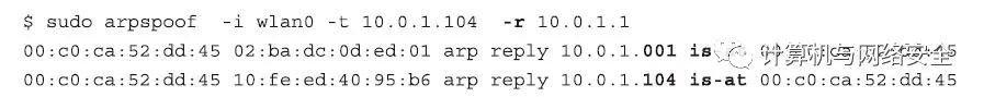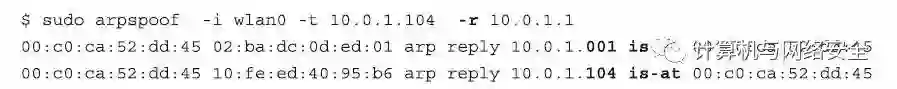 除了上面的“ARP攻击”,如果我们想使用“ARP欺骗”,以便可以看到双向完整的对话内容(有时称为“全双工”(full-duplex)),这时,我们需要传送逆向数据包给“上游路由器”。在这种情况下,需要发送“ARP-Reply 10.0.1.104 is-at 00:C0:CA:52:DD:45”命令,以便再次“欺骗”网关,那个本应给被攻击客户端的数据,先发到发动攻击主机这里。完成上述操作,我们可以通过运行一个名叫arpspoof的程序来自动完成,并且在需要使用最后一项功能的时候,在命令行中使用“-r”参数告知程序。