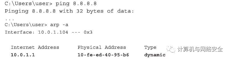 在进一步“ARP攻击”之前,让我们先设想一下,如果从Windows操作系统中通过ping命令测试8.8.8.8这个IP地址,那么将发生什么事。首先,我们的客户端主机会检查它的“路由表”(routing table)怎么做才能连接到8.8.8.8这台主机,随后,我们的客户端发现,要想完成这样的操作,首先得发送数据包到其IP地址为10.0.1.1的上游路由器。然后,为了与10.0.1.1通信,我们的客户端会检查“ARP表”,以便查找IP地址为10.0.1.1的主机的MAC地址。由于在上面的命令中,我们已将10.0,1.1这个IP所对应的MAC地址改成了一个假的00:c0:ca:52:dd:45地址,所以这时我们的客户端会误将这个地址认为是默认网关的MAC地址。最终,上面我们的客户端本来是想通过ping命令向IP地址为8.8.8.8的地方发送“Internet控制报文协议回声查询”(ICMP Echo Request)数据包,结果到了MAC地址为00:c0:ca:52:dd:45的地址上。如果我们恰好有一台Linux操作系统主机的MAC地址就是这个,那么这个数据包就会到达我们这台Linux操作系统的wlan0接口上。