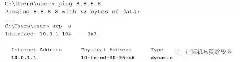 现在,如果我们做一些事情,只要该动作可以导致一些数据流向网关,那么上面的ARP表就会因为笔记本电脑向网关发送了ARP“who-has”数据包而发生改变。例如,我们可以ping一下Google的公共DNS服务器的IP地址,虽然我们ping的是外网的地址,但由于ping的数据包经过网关,所以等同于数据流向网关,因而,很快,Google的公共DNS服务器的IP地址就会被加入到ARP表中。