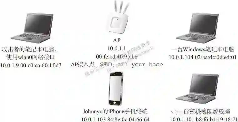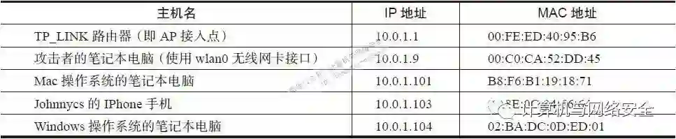 “-M arp”参数指的是让Ettercap使用ARP“中间人攻击”(Man-in-the-Middle,MitM)技术进行攻击。Ettercap程序将会扫描所有wlan0接口所关系的子网上所有的客户端。在前面的例子中,子网使用的是10.1.0.0/24这样的子网,而这样的子网共有255种IP可能,所以程序会在wlan0这个无线接口上,生成255种不同ARP“who-has”查询数据包。
