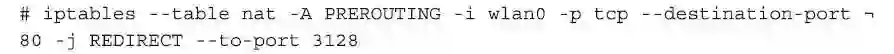 在防火墙内核初始化结束后,要拿到有用的默认值,我们只需要改变一个规则,那就是重定向上面这个客户的数据流向。下面的规则设置就是将所有来自于wlan0的、绑定为TCP协议的80端口的所有TCP数据包统统都转到本地主机的3128端口中去。该命令的转发是针对任意IP址的。