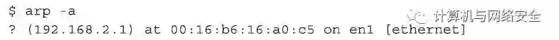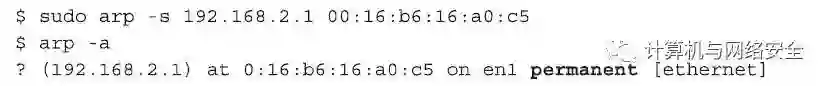 在这个例子中,我们说192.168.2.1是您的默认网关,并且您也坚信这个默认网关当前没有被黑客攻击。那么如果您想把这个默认网关的“IP地址-MAC地址”映射静态关系手工地添加到自己的“ARP表”中,进而避免攻击者的“ARP欺骗”攻击,那么您可输入以下命令: