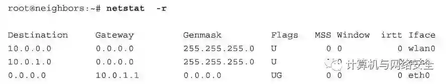 我们可以通过使用netstat命令检测“路由表”(routing table),在这里,我们可以看到无线接口wlan0的IP地址是10.0.0/24,而有线以太网接口eth0的IP地址是10.0.1/24,默认的路由器地址是10.0.1.1,这是有线接口eth0提供互联网接入的路由地址。如果这种设置让您感觉到迷惑易混,那么记住一个原则:在地址中,“1”的数量越多,就离您越远,就越是属于更远一级的路由。