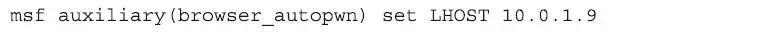 正如您从输出看到的,这个版本的Metasploit装了16个独特的客户端漏洞检测模块。如果“被占领主机”可以被定向到http://10.0.1.9:55550/ads,那么browser_autopwn模块将检测该客户端浏览器的类型和版本,并且向其传送一个相匹配的漏洞攻击。这里获得浏览器类型和版本的方式是通过“JavaScript脚本”和“用户代理解析”(User-Agent parsing)实现的。