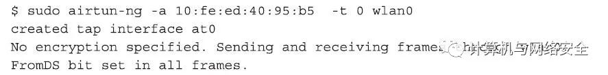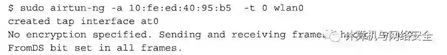在上面命令中,“基本服务集标识”是通过参数“-a”指定的,参数“-t 0”是用于将ToDS位设置为0,同时将FromDS位设置为1。然后创建虚拟接口at0将只能与客户端进行通信。