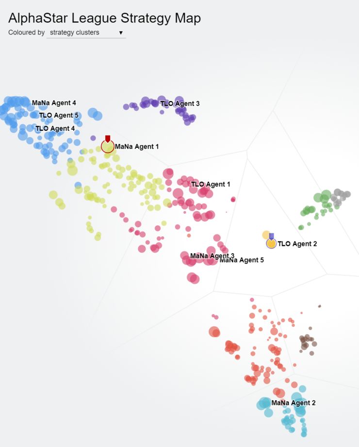 其次,虽然 AlphaStar 和围棋 AI AlphaGo 一样都是以自我对局作为重要的训练策略,但在星际 2 中,策略的遗忘和互相克制更加明显,并没有某一个策略可以稳定地胜过所有其他的策略,所以继续使用简单的自我对局学习会让智能体陷入在不同策略间游移但水平停滞不前的境地。为了应对这个问题,DeepMind 采用了群体强化学习的训练策略(上文中提到的 AlphaStar league),用一个群体中许多不同个体的各自演进来保存并持续优化各种不同的游戏策略。