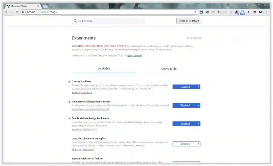 输入 chrome://flags,这个命令将打开 Chrome 浏览器的功能特性界面,我们可用来启用或者关闭某些 Chrome 的实验功能。flags 页面按照 Available、Unavailable 两种标签页显示项目,如果用户明确知道需要查找的实验项目,可以使用顶部的搜索栏,或者在地址栏直接输入 chrome://flags/#(项目名称),比如我要查找 overlay-scrollbars 项,那么只需要输入 chrome://flags/#overlay-scrollbars ,即可直接定位到目标选项。