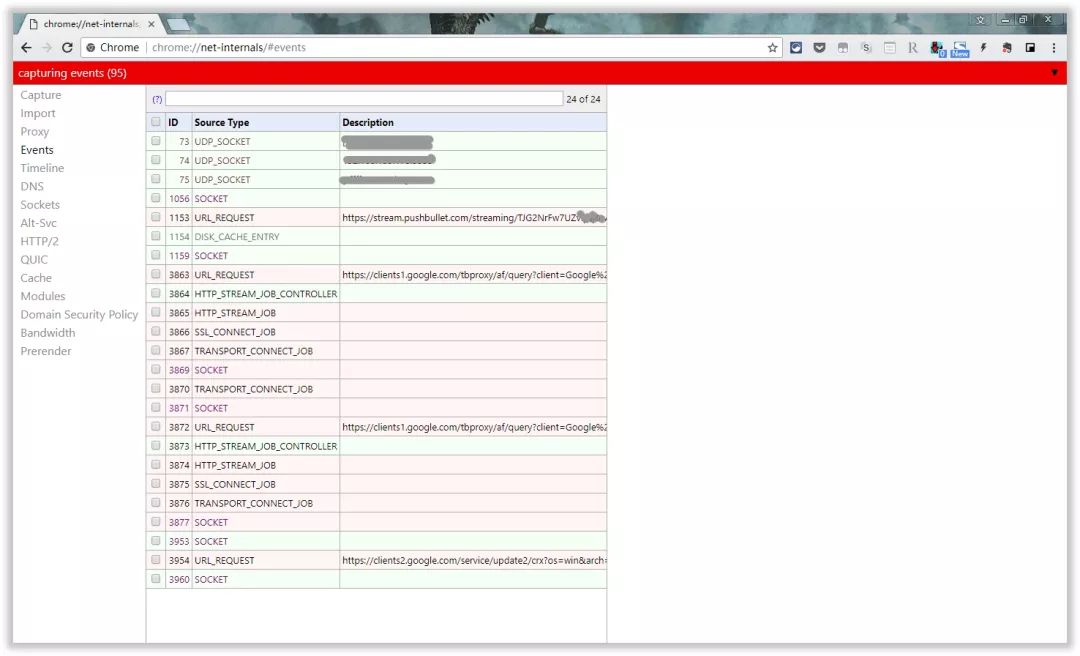 输入 chrome://net-internals 后打开一个显示网络相关信息的页面,这个命令主要用来捕获浏览器生成的网络事件,默认会显示当前连接的网络服务事件,可导出数据、查看 DNS 主机解析缓存。