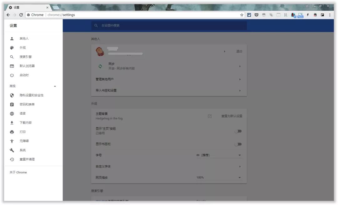输入 chrome://settings 将快速打开 Chrome 浏览器的设置页面,页面的内容分类划分为基础和高级设置选项,基础项细分为其他人、外观、搜索引擎、默认浏览器、启动时,高级项有隐私设置和安全性、密码和表单、语言、下载内容、打印、无障碍、系统、重置并清理,最后一个就是「关于 Chrome」的选项。