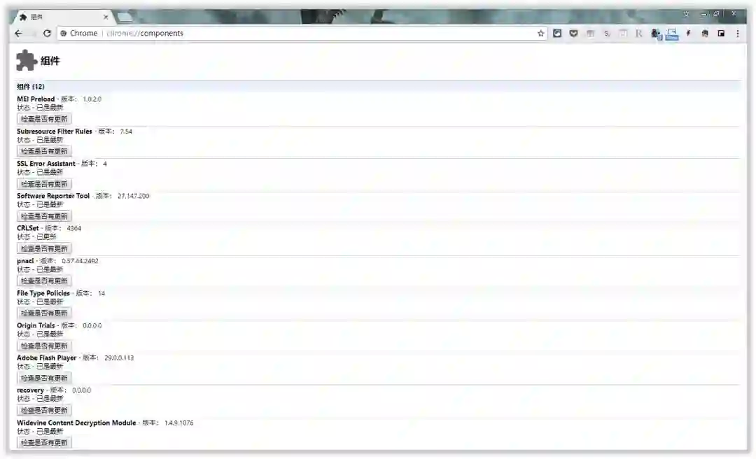 输入 chrome://components,这个命令显示 Chrome 浏览器所有用到的组件,在这里可以查看常用的 Flash 组件的版本,并检查是否有更新。