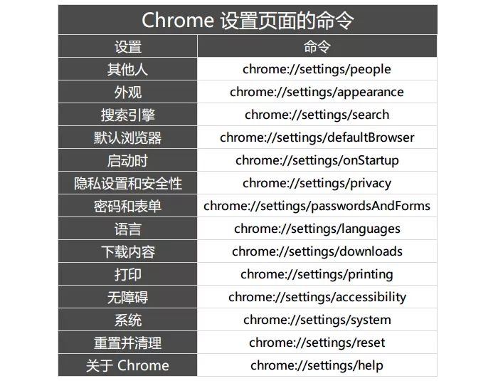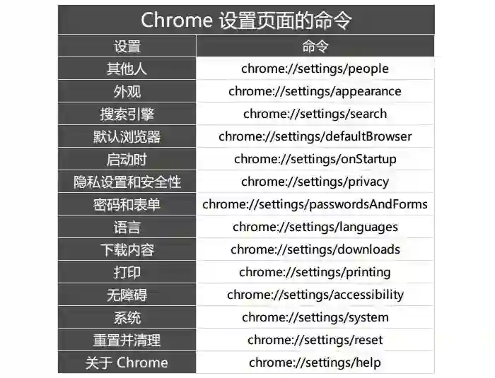 每个细分选项通过类似 chrome://settings/xx 命令来快速定位,下面是对应命令: