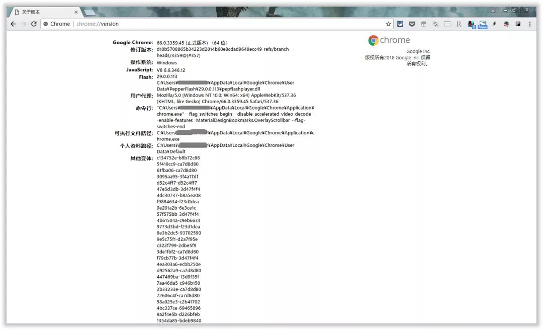 浏览器地址栏输入并打开 chrome://version,页面显示了当前浏览器版本的详细信息(比如我安装的 v66.0.3359.45 Dev 版本),本地操作系统类型,JavaScript、Flash 软件的具体版本和文件存放位置。