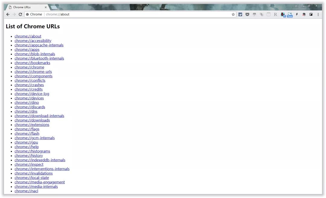 用户如果还对如何找到这些浏览器命令感到困惑的话,输入 chrome://about 命令,将集中列出 Chrome 浏览器支持的所有的命令,分为了 Chrome URLs 以及 Debug 用途的命令。