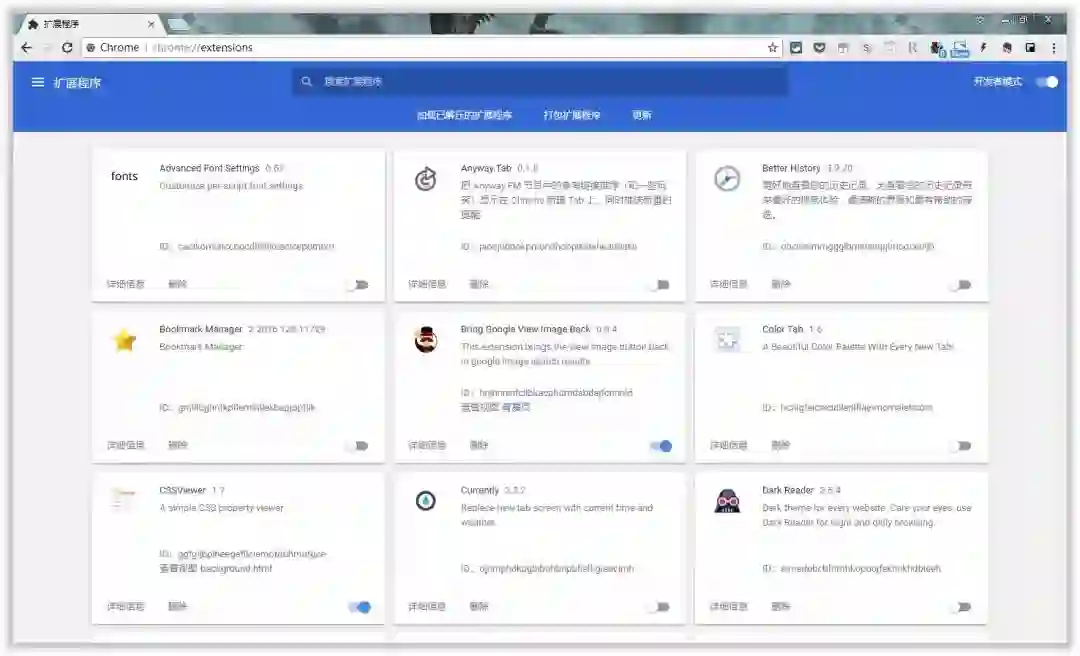 输入 chrome://extensions,这个命令方便取代以往进入两三级菜单才能打开浏览器已安装的扩展程序页面(需打开「菜单 - 更多工具 - 扩展程序」),扩展页面的常规功能包括了打开/关闭开发者模式、手动加载/更新扩展、搜索安装的扩展程序、手动关闭/打开/删除某个扩展。另外,页面侧边栏还隐藏了键盘快捷键的页面,用户同样可在地址栏输入 chrome://extensions/shortcuts 快速打开,集中管理用户为每个扩展设置的键盘快捷键组合,以及设置是否在全局或者只在 Chrome 本身激活快捷键。