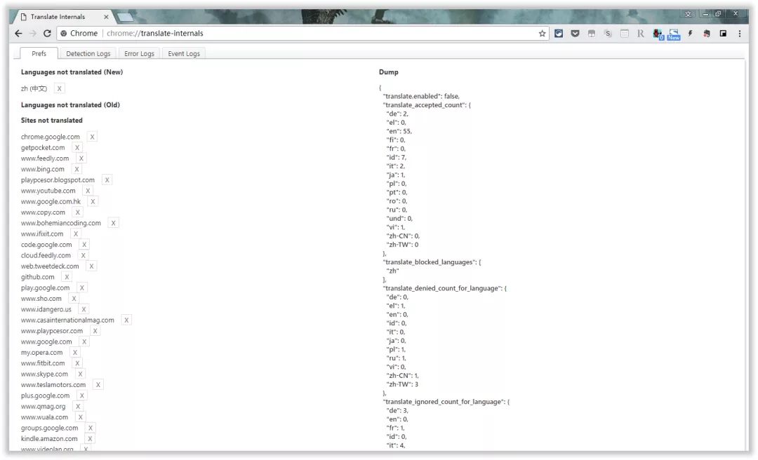 输入 chrome://translate-internals,打开浏览器内置翻译功能的页面,显示了页面是什么语言的情况下不提示翻译、哪些页面不再提示翻译、以及哪些语言组合是提示翻译,用户还可以手动关闭哪些以前设置过的翻译选项。