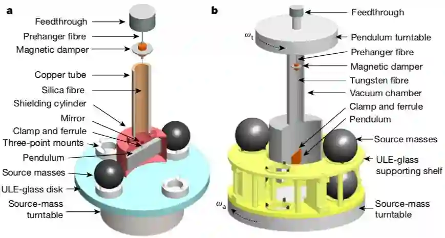 转盘用于改变球体在“近”和“远”方位间的位置(上图显示为“近”;在“远”的摆放位置中,转盘旋转90°)。安装在摆锤和球体之间的空心镀金铝圆柱体,用于保护系统免受静电场的影响。摆锤和源质量块放置在同一真空室内,通过离子泵维持约10的负5次方Pa的压力,摆锤扭转由光学杠杆监控。