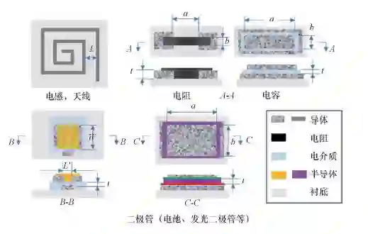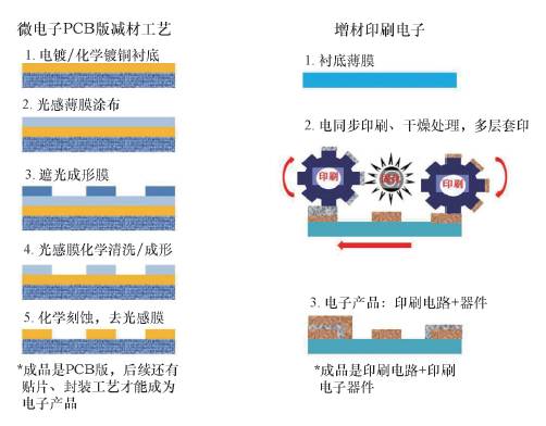 传统微电子生产工艺是在洁净室通过高真空蒸镀及减材制造技术来完成的。其突出的缺陷表现在:蒸镀设备及工艺成本高,运行费用昂贵;减材制造电路板耗时耗材,排放成本高,且废液造成重金属及化学污染;此外,电路板还存在芯片及其他元器件与电路板贴片封装等后续工艺。与传统微电子相比,印刷电子技术运用优化的图形印刷作为其增材制造工艺,使功能性材料在衬底上一次成形,无需后续减材成形。印刷电子增材制造将电路及功能性器件(如集成电路、电阻、电容、电感、传感器)同时印刷,免去了后续贴片工艺(图1)。不仅大大简化了生产工艺,节省材料,而且近于零污染排放。同时,印刷电子增材制造可以达到大面积、高产速、低成本量产,其产品具有柔性、大面积功能化分布及廉价等诸多优势。这将开拓传统微电子无法企及的潜在应用市场。