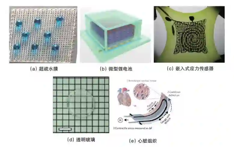 在材料适应性方面,墨水打印技术具有更多的优势。这里所涉及的墨水打印技术主要包括墨水直书写与电流体喷印技术。对于前者,国内外研究人员相继报道了对于黏稠硅胶体系的线条精确编织,增材制造弹性、功能多孔材料系统,制备的样品体现出拓扑可控的能量吸收性能与表面浸润性能(图8(a))。利用功能材料墨水设计,可以实现功能器件的直接制造。如微型锂电池(图8(b))/石墨烯超级电容、嵌入式应力传感器(图8(c))、梯度多孔陶瓷、透明玻璃(图8(d))、心脏组织(图8(e))等。对于极具代表性的3D微型锂电池(图8(b)),研究人员选取了低体积膨胀率的新型钛酸锂与磷酸铁锂分别作为正负极材料墨水,通过设计墨水组分提高其可打印性,并以叉指结构方式进行制备,同时实现了高能量密度与高功率密度。而最新的报道中,研究人员基于压阻、导电与生物可兼容材料设计出6种不同的墨水,进行电极、传感与封装的分别制造,最终实现传感-驱动一体化的人造心脏组织(图8(e))直接制造。由于其数控结合度较高,使用范围广,该技术正在成为介尺度器件制造的重要工艺。直书写使用的墨水耗材一般表现为非牛顿流体,并且受限于喷嘴大小与墨水之间的耦合,能打印的特征线宽在10 μm量级。