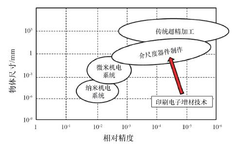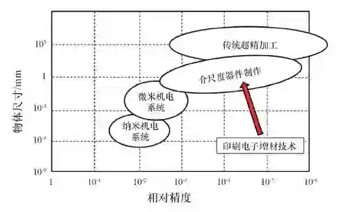 对于普遍意义的功能器件,其主体尺寸介于宏观和微观(一般认为在几十μm到cm)之间,被称为介尺度(mesoscopic)(图6),已经广泛应用在生物技术、汽车、航天、军事、半导体、医疗机器人、光学通信等领域。对于制备介尺度3D结构,MEMS微加工技术往往受限于硅基材料,并且仅完成2D和2.5D的低纵横比结构制备;高纵横比结构可以通过深刻电铸造模造(LIGA)技术,但其成本高、加工缓慢。超高精度加工中心进行微加工,尽管节省了昂贵掩膜的费用,却面临较差的容积比和大量的能源、材料消耗。有效突破材料与工艺局限,提高整体利用率、减少能耗,明显提升器件性能,一直以来是器件一体化制造的重要考虑。纵观印刷电子(printed electronics)领域的发展,无论是喷墨技术与电流体动力喷射这类数字技术,还是丝网、凹版、微接触版等印刷技术,分辨率主体集中在0.1~10 μm量级。印刷电子所涉及的材料及沉积工艺,当结合系统数控与路径设计时,极易实现在立体空间的三维堆积成型,也正成为功能器件一体化增材制造的重要方向之一。