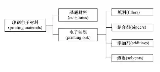 印刷电子作为增材电子制造技术,是基于具有导电、介电或半导体电学特征的各种电子油墨,采用微纳米印刷工艺技术(包括丝网印刷、数字喷墨印刷、柔版印刷、凹版印刷以及纳米压印等),通过多层套印的印刷方式完成电子油墨在不同承印基材表面的图形化转移,进而实现印刷制造电子电路以及元器件产品的科学与技术。从材料学的角度看,印刷电子材料主要包括基底材料和电子油墨两部分;而电子油墨通常包括电学材料、黏合剂、添加剂和溶剂4方面的组份(图5)。
