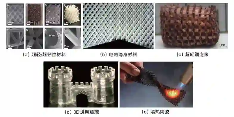在众多增材制造工艺中,光固化SLA/DLP(stereo lithography apparatus/digital light processing)、墨水数字打印作为介尺度器件制造的报道较多。由于在成型速度、精度与复杂性方面综合表现较突出,光固化技术成为功能器件微制造最新发展的主要载体之一。麻省理工学院Zheng研究组报道了利用光固化方法制造高度有序晶格(lattice)结构,并通过拓扑与组分优化实现了材料在低密度下杰出的刚性和强度(图7(a))与负热膨胀系数的特殊性能,使得这类超材料在减震器、隔音装置等领域具有很大的应用潜力。西安交通大学研究组利用服务等级协议(SLA)技术,实现了诸如渐变折射率的三维电磁隐身罩(图7(b))、梯度介电常数的龙勃透镜天线、三维光子晶体等。中国科学院研究团队以DLP制备3D模板,通过结合无电沉积方法,得到了超轻铜基金属泡沫,压缩50%仍可迅速回弹(图7(c))。基于进一步的光固聚合物功能化设计,德国Karlsruhe 理工学院与美国HRL 实验室分别完成了复杂三维透明玻璃材料(图7(d))与耐高温隔热陶瓷材料(图7(e))的制备。