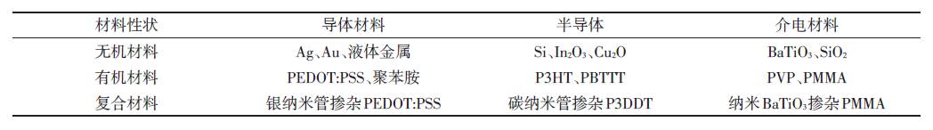 填料。填料是印刷电子器件的核心。按照材料的导电性能划分,填料主要包括导体材料、半导体材料和介电材料三大类。而按照材料的化学组份划分,电子材料可以分为无机电子材料、有机电子材料和复合电子材料(表3)。两种划分维度交叉形成3 大类9 小类,以下将以此为框架作简要评述。
