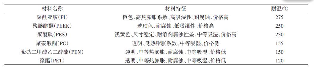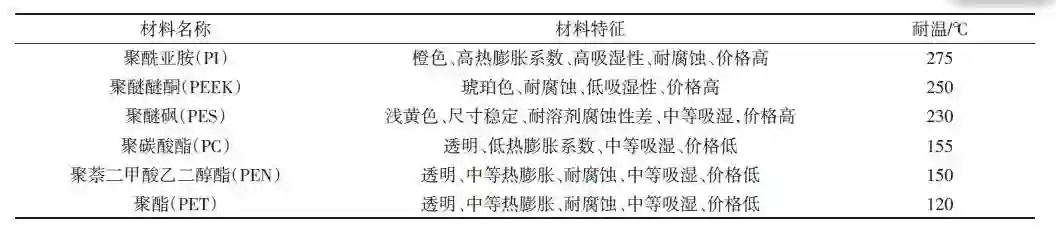 基底材料。印刷电子基底材料的选择涵盖硅、玻璃、金属箔、纸和有机高分子材料等几大类。但是鉴于大面积、抗拉伸、耐温好、低成本、柔性化和轻薄化的市场需求,当前印刷电子基底材料的研究和应用主要聚焦于有机高分子材料上,其他材料由于各自的缺陷,应用范围已经大大缩小。例如,硅基材料弯曲性能相对较差,而且成本较高;薄玻璃弯曲性能较好,但脆性高;金属箔耐高温,但粗糙度高且成本高;纸张价格低廉,但耐温性、吸墨性、粗糙度和抗拉伸强度方面的表现较差。比较而言,有机高分子材料综合了高弯曲特性、透明性、低成本等特征,因此有机高分子基底材料获得了广泛使用。表2列举了目前广泛使用的有机高分子基底。然而开发尺寸稳定、耐高温、耐腐蚀、低吸湿、低成本的印刷电子基底材料,仍然有很多的研究空间,需要在材料方面开展更加深入和广泛的研究。
