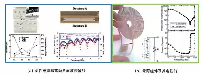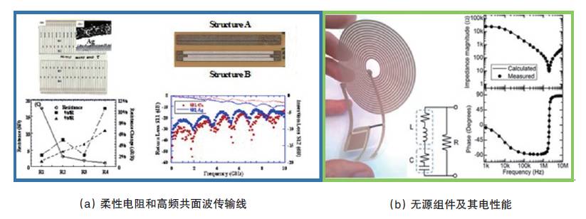 图3中的无源电子器件,电阻和高频共面波传输线(图3(a))是用非接触挤压材料增材制造工艺打印成型的。其中电阻的终端导体是导电银,电阻是碳电阻材料,衬底是PET(聚酯材料)。同样的电阻材料,不同的a/b值(图2),可以得到不同阻值的电阻;不同阻抗的材料,用同种a/b值设计,也能得到不同阻值的电阻,这为电路设计和平面布局增加了很大的自由度。在设计合理的情况下,用增材挤压打印可以将印刷电阻的稳定性和重复印制的变化率控制在5%以下。将非接触性打印的银质高频共面波传输线与传统的铜膜减材制造的同种器件的性能比较显示,两者的频率和相限是一致的。由于印刷银浆材料与铜膜的导电率有差异,所以这2个几何尺寸相同的高频共面波传输线的振幅有所不同,这是在意料之中。这个结果证实了器件设计、材料基本功能与生产工艺需同时优化以得到性能优化的印刷器件。图3(b)是用接触性丝网印刷成型的简单无源RCL电路及其电性能测试。这个RCL电路是教科书上的一个典型无源电路示例,用来测试在不同频率下电阻(R),电容(C)电感(L)和组合电路的工作情况。从图中的电路在不同频率下的工作特性看,印刷RCL电路的测试数据与理论计算值吻合。无源集成电路在DC-DC转换器、电压放大等电路中都会用到。如果用增材印刷的方式来成型这些电路,可以省去R、C、L等元器件及其贴片封装等工艺,也节省了大量电路板用来贴片的表面,因为RCL电路印制在柔性衬底上,封装后可以直接用于其他器件的衬底,工业界称这种RCL为埋件无源器件(embedded passive)。