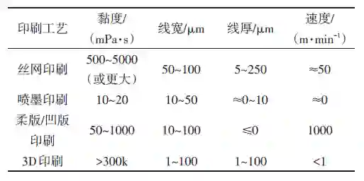 有别于图形印刷由点阵排列的墨点来完成以及展示图像的深浅和色彩效应,增材制造功能性电子/光电器件需要以连续的几何图形结构来提供光/电子传输通道。这些功能性器件通常是三维结构,需要由多层套印的增材印刷来完成。图2列出了几种典型电子和光电器件结构,其共通性是在平面为几何图形,在剖面可见不同材料层层叠加的立体结构。用增材制造成型这种功能性器件,每一层结构成型只需印刷和干燥2个步骤;而用减材制造,每一层结构成型则需要5~6步工艺完成(图1)。显然用增材工艺逐层印刷生产的电子元器件具有省时、省材、绿色环保等多种优势,是智能制造的一个很具说服力的案例。当然,与发展创新中的其他先进技术类似,印刷增材制造电子技术还有待完善和不断开发。印制功能性器件和产品,图2中各层平面几何尺寸的精确度(a, b,W),平面结构之间的间距(l),印制材料的厚度(t)等直接决定成型器件的光/电性能/性能优化。以图2中三极管结构为例,多层增材套印始于栅基极(gate),然后逐层套印绝缘体(dielectric)、发射极(source)/集电极(drain),最后是半导体层(semiconductor)。这种场化效应三极管(field effect transistor,FET)器件及电路性能的优化,取决于各层材料的平面印刷精度和逐层套印精度,这是对图形印刷工艺的一大挑战。发射极/集电极之间电子通道的间距(L′)和绝缘层厚度(t)的精度控制会因不同的印刷工艺和材料组合而不同;印制工艺套印的精度直接影响栅基极设计以及与电子迁移通道(发射极/集电极间距)的对准,这些误差将三极管的电子迁移率(μ)降低1~3个数量级。同时,印制器件的光/电学性能还与材料层与层之间的化学(表面功能性基团等)以及物理(表面亲和力、表面的平滑度等)参数密切相关。这些化学和物理参数的匹配与优化将减低界面内阻,从而提高器件的光/电性能。值得一提的是,功能性器件的增材制造一般会涉及到2种以上的材料(图2),而且由于材料的功能性和流变性不同,不同的材料可能会用到不同的增材工艺,如丝网印刷(栅基极、发射极/集电极),凹版/喷墨印刷(绝缘体、半导体)等。这样,印刷电子增材制造工艺流程可以是多种印刷工艺结合的复合式增材工艺,这对印刷设备的集成和印刷工艺之间的匹配以及优化增材制造工艺都是挑战。表1列举了几种典型的印刷工艺对材料黏度要求范围和印制图形特征。