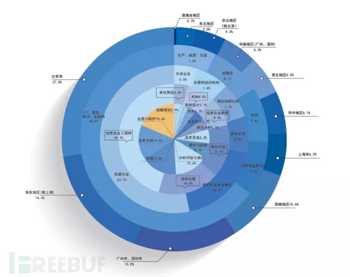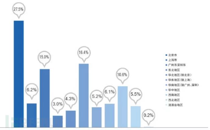 我国信息安全从业人员以男性为主,多数为本科学历并具有计算机教育背景,与全球信息安全从业人员的构成基本一致。同发达国家相比,我国信息安全从业人员年龄构成相对年轻,从业年限整体上也相对较短。在地域分布上以北上广深四大一线城市最为集中,此外在最具经济活力、电子信息产业规模化发展的长三角地区,以及安全企业和信息安全强校汇集的西南地区也比较集中。
