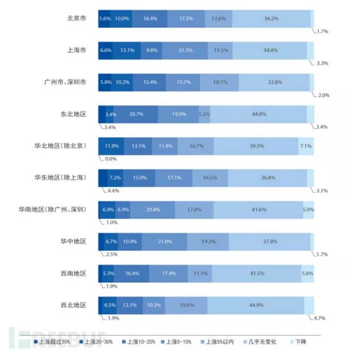 受访者不同地域薪酬变化分布图(样本量 1950 人)