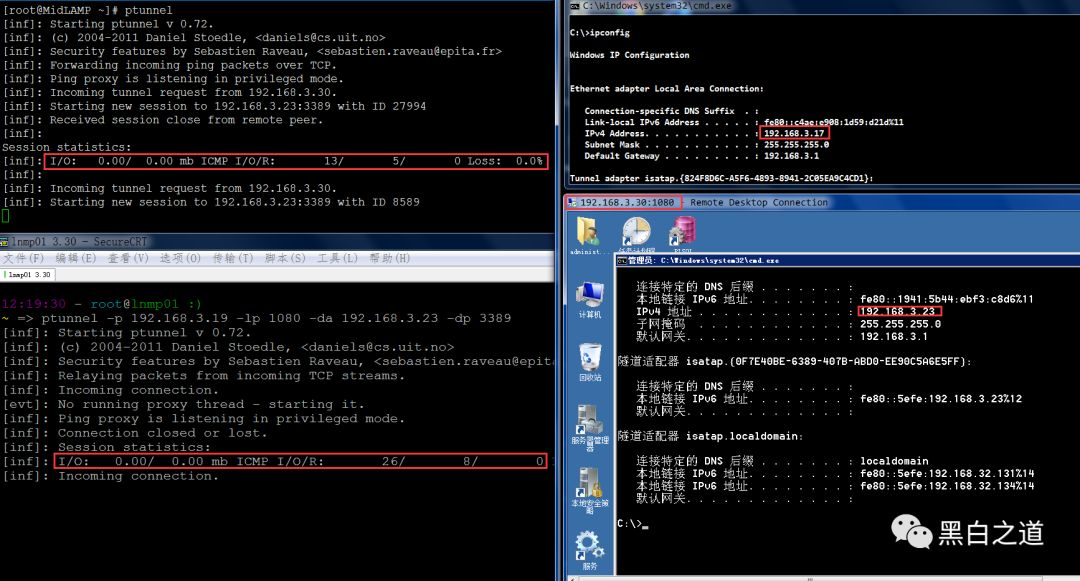 # ptunnel -p 192.168.3.19 -lp 1080 -da 192.168.3.23 -dp 3389