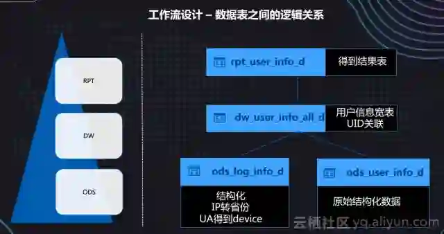 接下来进入数据开发阶段,数据开发阶段要去实现如图逻辑,左边ods_log_info_d这张表存着我们的日志信息,我们要去公开一个结构,将用户IP地址解析出来一个一个地域信息。右边ods_log_info_d用户的基本信息已经是结构化了,这两个数据通过UID进行关联,JOIN成一张大表,原封未动的将我们的数据采集到MaxCompute上来,然后在DW层里面做更多的关联,关联出一张用户去访问我们广泛基本信息的宽表,然后基于这个宽表之上,我们有一个IP地址,要知道这个用户PV的具体数据,比如求平均值或者求在整个网站访问的最佳深度等。
