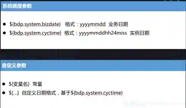 调度参数方面,比如说将数据如何去写到一个最新的分区,比如说分公司24号对应的分区里面,25是新的一些事情,如何去起到新对应25号的分区里面去,我们提供这样的参数,当你配置这样的系统参数时候,每次在我们调度系统的时候会自动进行切换,一些日期不需要你每次手动去创建分区。