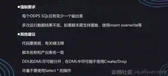 我们强调每一个节点里面最多输出一张表,当你有多张表的时候,比如说任务失败了,可能是因为其中某一条处理的逻辑失败了,当你去重跑的时候,可能整个任务都要重新去跑,另外,你的输出表表格一定要跟你的节点名称一样,这样可以快速从你的输出运维上,快速找到这张表的数据在哪个节点上没有产生,是因为哪一些任务失败了。