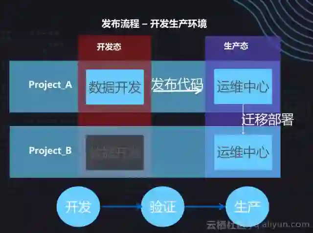 在公共云上,我们有一些公共云的服务,还有一些私有化服务,比如说安全行业、金融行业,通常都需要将大数据部署稳定,我们的项目创建的一个或者两个如何区分?通常情况下会有开发和生成,开发就交给数据开发团队去把数据任务开发好、调试好,然后发布到生产环境上去,生产环境上更新一些配置的调度信息,比如说按天、周、月等等去运维,对他的数据开发流程要求特别严,通常情况下有更多的事情发生,包的开发、测试,还有一些预发环境和生产,整个代码环境都会去详细的进行运维,你去创建的时候,可以在项目配置中去调试,比如说在开发项目里面,通常情况是不打开调度参数,就是说你创建的客户提交之后,不会每天自动去调度,当你把任务发布到生产的项目上面,根据你的配置更新每天去同步。