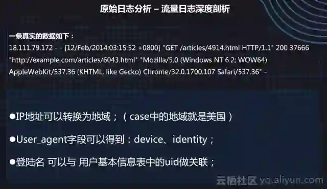 原始数据可以通过这些字段里面去获得什么样的信息?一个日志信息里面,包含用户来访问网站或者平台IP地址、用户登录名,然后通过一些字段可以分析设备信息,比如说我们可以从用户真实的数据里面看到IP地址,包括什么时间去访问,访问了我们哪一个页面,使用了什么样的浏览器,浏览器内容是什么,有的直接用手机端等等,我们可以通过这些信息去挖掘出更多的信息,比如说可以通过IP地址知道用户长居住在哪个城市来访问我们网站,通过user_agent字段可以获取设备信息,因为我们去访问终端一些版本,设置可以通过这些数据进行一个结构化,然后把数据抽象处理。