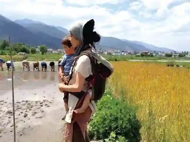 ▲六的妻子阿雅,抱着儿子,在田边看男人们倒退着插秧。