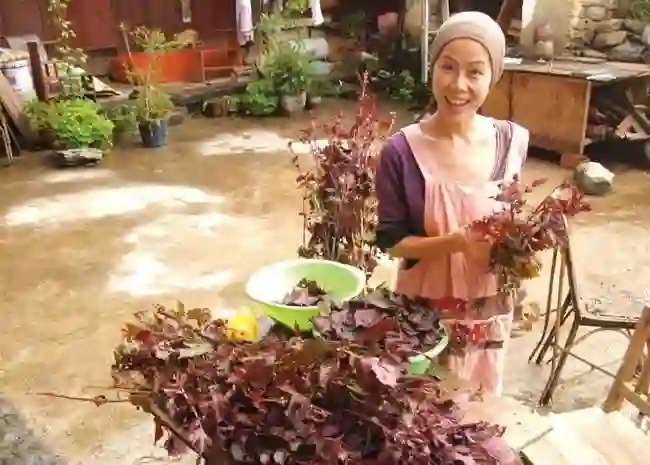 ▲阿雅从田里收回来的紫苏,做紫苏鱼和饭团,还用紫苏染布。