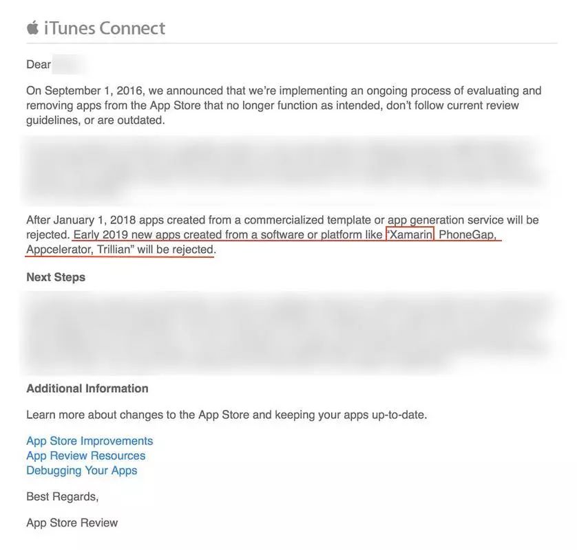 据推特网友 @jzeferin0 爆料,他的朋友收到一封苹果的邮件通知,里面提到,从 2018 年 1 月 1 日起,所有由商业模板或 App 生成服务制作的 App 将会被拒,到 2019 年,由跨平台软件或平台所创建的 App 也将被拒,其中被点名的软件或平台包括 Xamarin、PhoneGap、Appcelerator、Trillian.