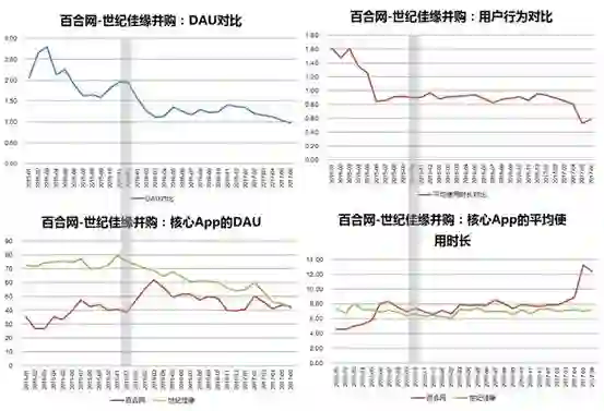 (对比为整合中的附属方数据比上主导方数据,即世纪佳缘数据/百合网数据)