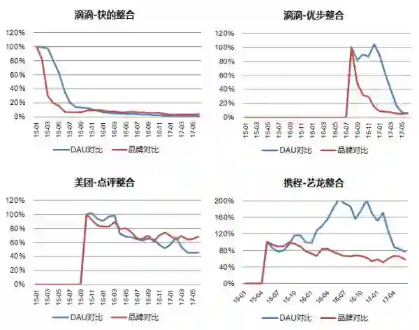 如果将用户量数据和品牌数据放在一个时间维度观察会更有意思,这里使用归一化之后的相对指标,可以看到在各种整合过程及方案下,两个产品的用户量数据以及品牌数据的相对量变化情况。其中灰色区域代表着整合公布之后时间段内的指标变化。
