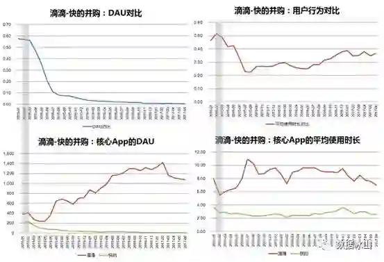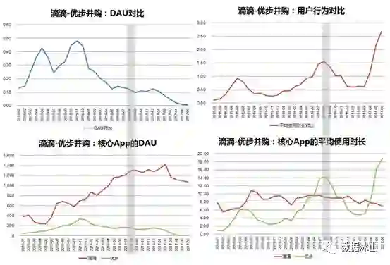 滴滴作为新公司的主导,无论是用户量还是品牌,滴滴用最快的速度(不到6个月)完成了整合以及对快的品牌的彻底消亡。从数据也可以发现,在完成整合之后,滴滴App的DAU和平均用户时长都有明显的提升。