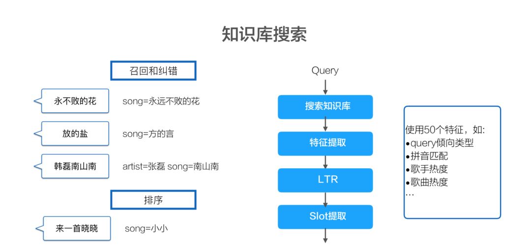 知识库的搜索就刚才说的那个韩磊唱了《南山南》的歌。我们首先要去判断这个领域去搜索知识库,然后找到相应特征,发现它可能在现有特征里,比如在歌名和歌手不满足的情况下,怎么去进行相应的匹配,从而找到一个最优的结果。