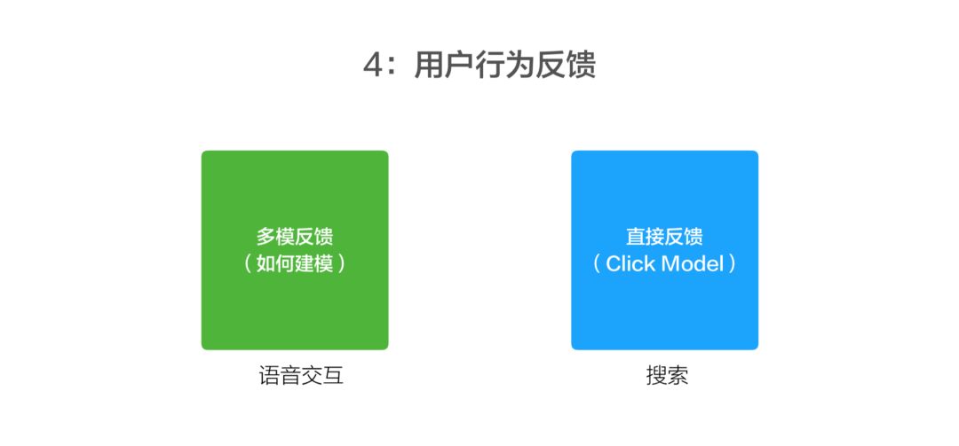 目前大家看到的是比较成熟的技术,用户点击反馈已经在搜索质量排序当中超过 60% 的重要性,但在语音交互这边,用户的反馈它是一种很隐式的,可能用户觉得你没听懂他,可能就会去换一种说法再问一下。