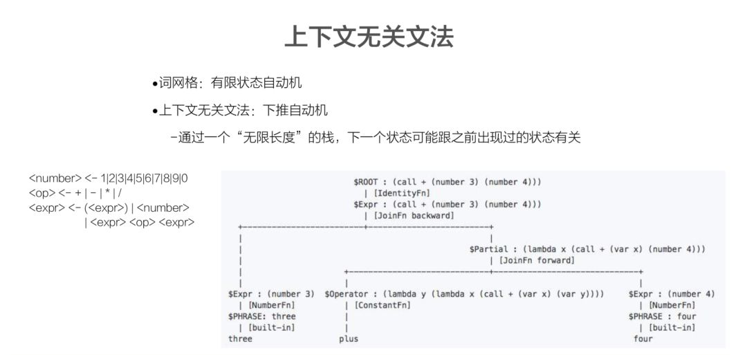 上下文无关文法,这是一位斯坦福教授提出来的,这个在很多那个垂直领域其实是很有关系的。刚刚我们看到的词网格的模型,它本身是基于一种有限状态思维逻辑,但是上下文无关文法是有下推的思维逻辑,它会无限的去扩展,构建出现在的模型出来。譬如,亲戚计算器,不知道大家知不知道小爱这个功能:爸爸的爸爸的爸爸叫什么?小爱同学会回答:你可以喊他高祖父。我们要解决这类问题,一定要选择相应方法。